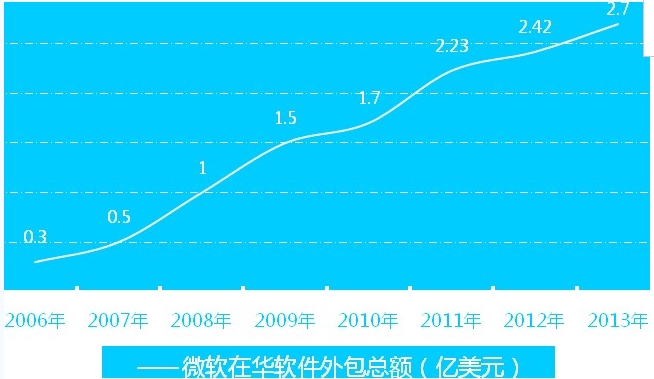 -過去幾年里,微軟持續增加對中國的全球軟件外包支出,具體金額從2006財年的3,000萬美元飆升至2013財年的2.7億美元(如下圖),僅七年時間便增長了9倍。
